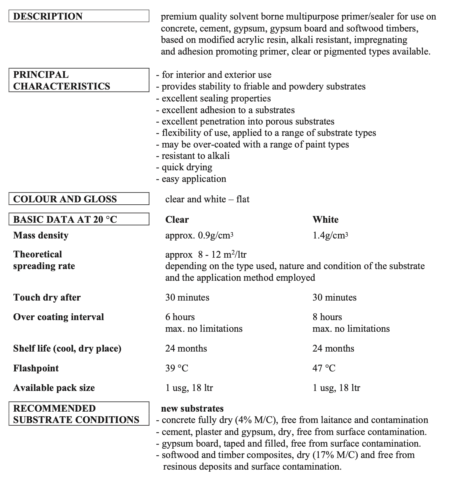 Premium quality solvent borne multipurpose primer/sealer for use on concrete, cement, gypsum, gypsum board and softwood timbers, based on modified acrylic resin, alkali resistant, impregnating